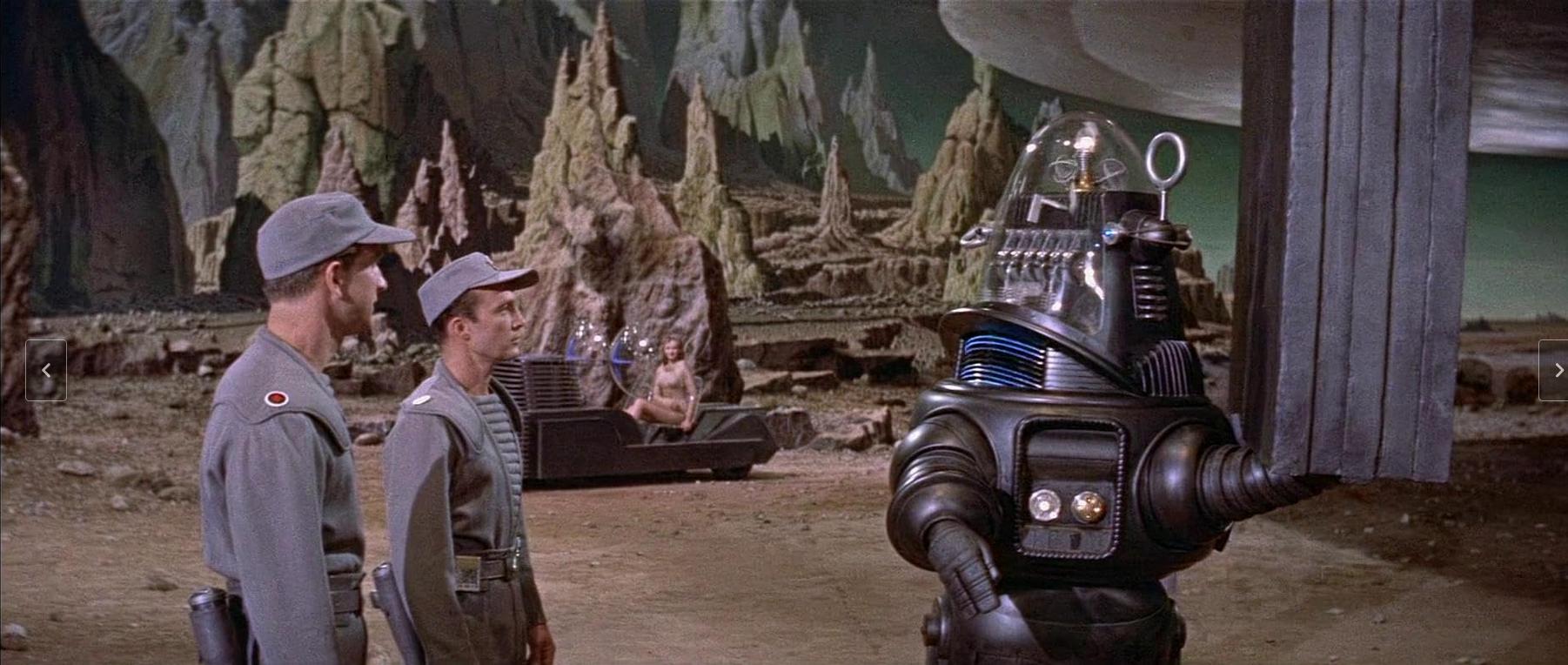 In addition to Anne Francis as Altaira, Walter Pidgeon as Dr. Morbius, and Leslie Nielsen as Commander John J. Adams, the film features Robbie the Robot. Robbie is not your average robot — certainly not for the average science fiction thriller of the 1950’s. Robbie can speak hundreds of Earth languages, synthesize and transport 10 tons of “isotope 217” to the starship’s landing site, design and fabricate garments for Altaira, and cook gourmet meals.