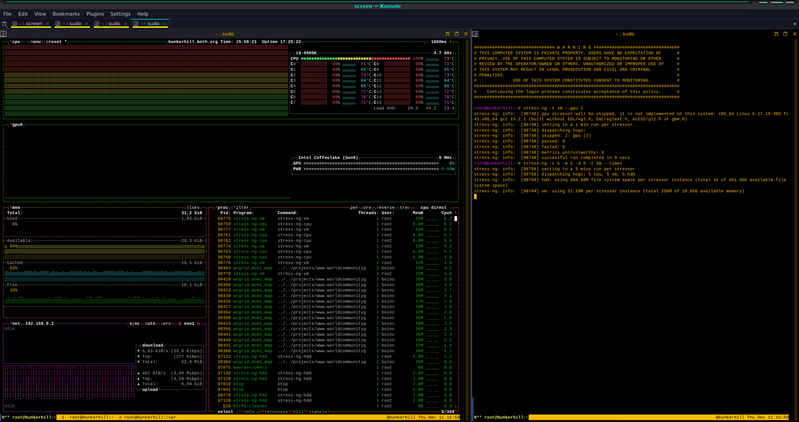 I like to view what’s taking place inside my test computers while running stress tests. There are plenty of options for this, but my favorites are btop, htop, and sometimes iotop.