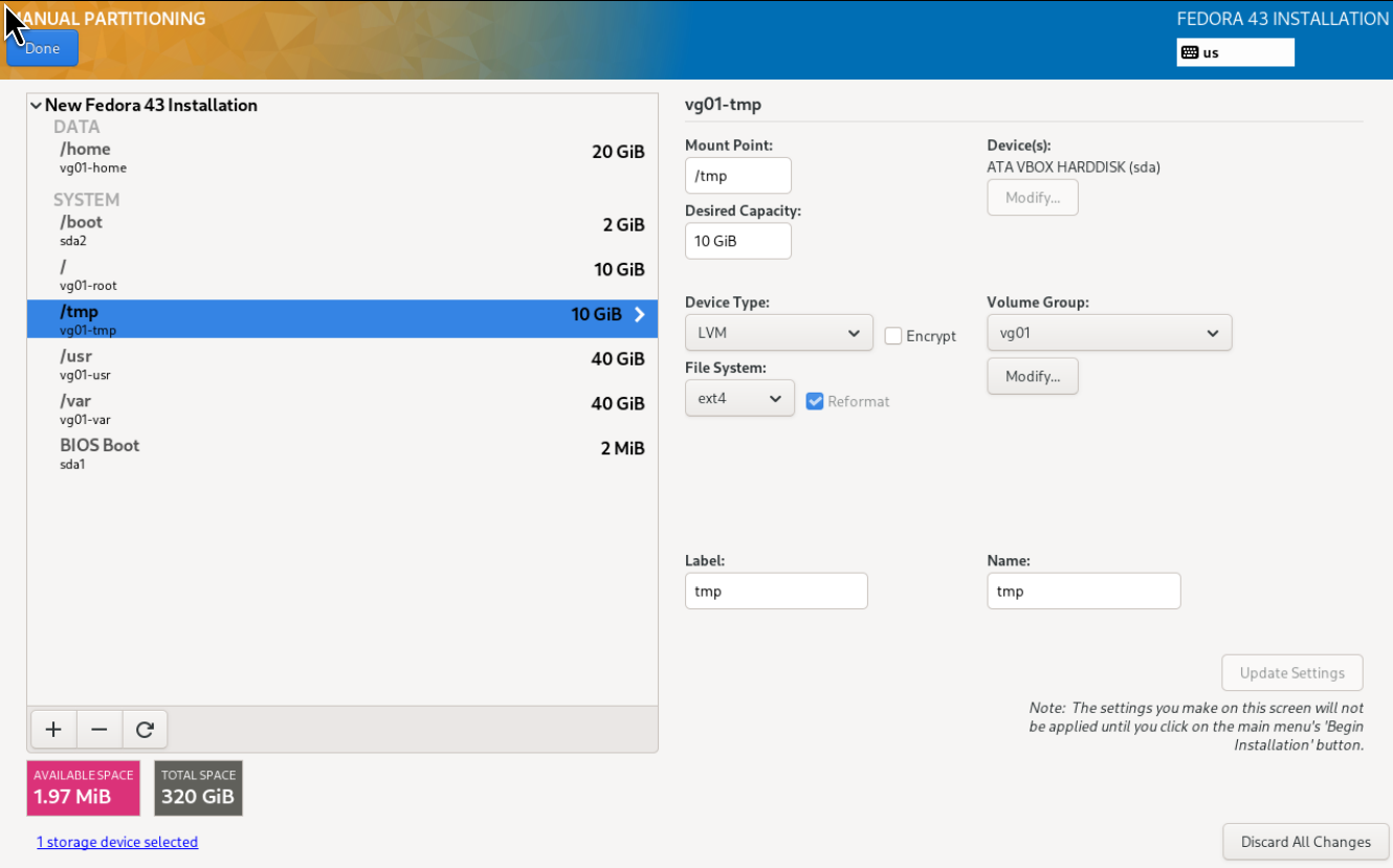 That little menu also allows me to select how large I want the volume group to be, and I always choose as large as possible to ensure that it takes up the rest of the storage device after allowing for the BIOS and boot partitions. The filesystems I create do not typically fill up the entire volume group; that leaves the rest of the volume group for later expansion of the individual filesystems when needed.