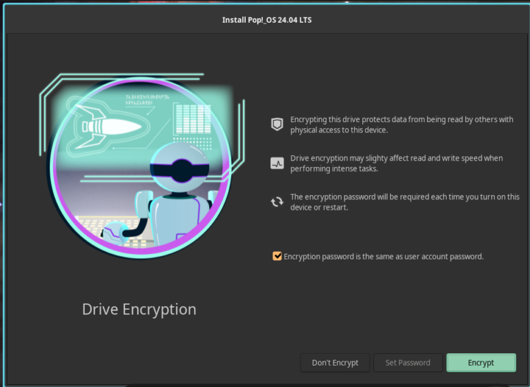 I chose not to encrypt my disk, but it’s configured to use your user password as the encryption password unless otherwise specified.