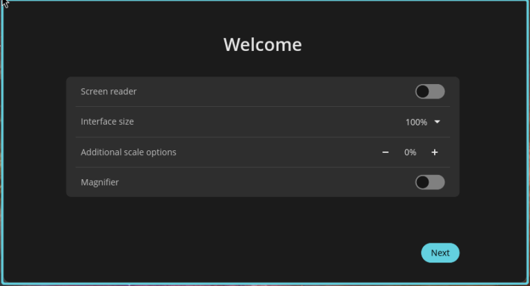 On the next screen, I can set the screen reader, interface size, additional scale options, and the magnifier. Kudos to System76 for putting accessibility first in COSMIC. The next screen is my chance to connect to the wireless networks I will be using. Following that is the choice of language I will be using. Then, a screen to set the keyboard layout, time zone, and location.