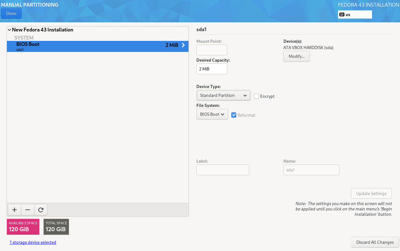Figure 8 shows the Manual Partitioning menu with the BIOS Boot partition already added. This can only be a Standard Partition. Although the installer let’s you choose an EXT4 filesystem or part of an LVM/EXT4 volume group (VG), it will display an error message across the bottom of the page.