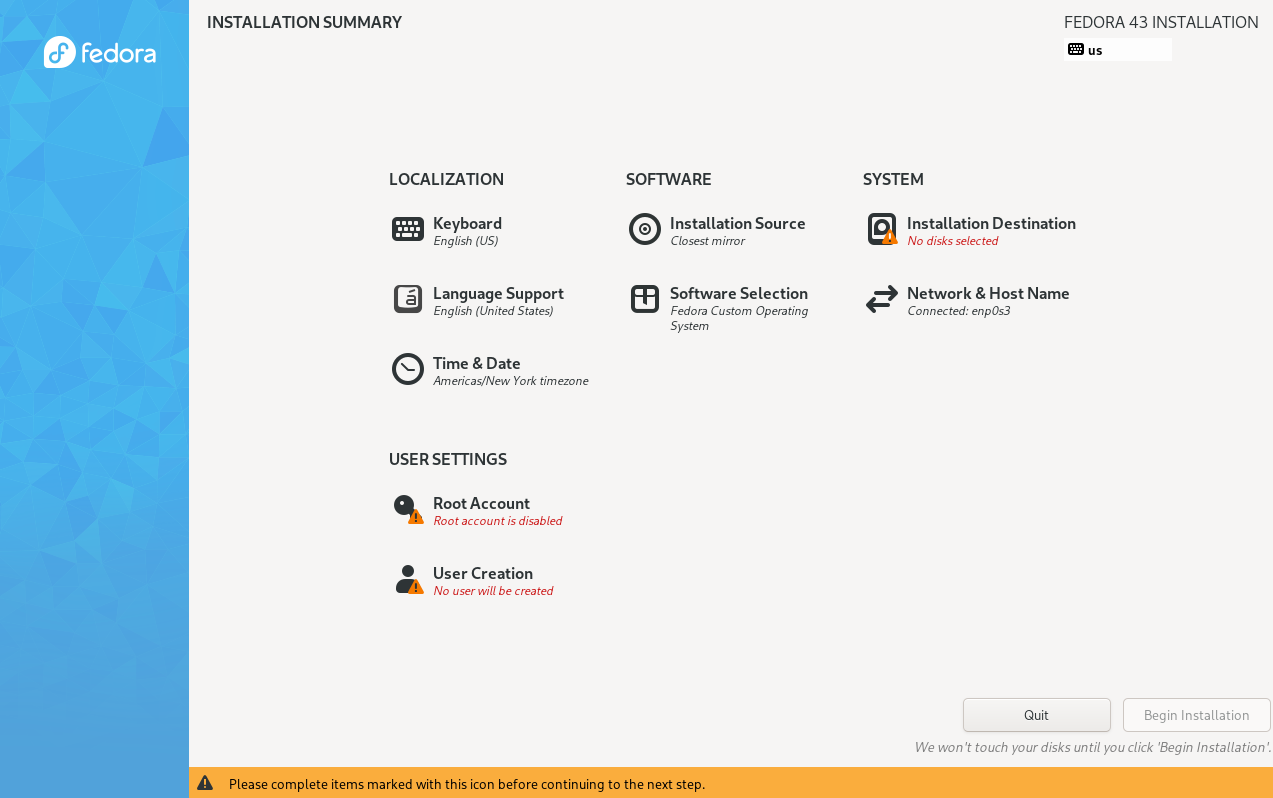 Next is the Installation Summary page seen in Figure 2. This menu page is exactly like the one for the Server Edition. You must configure the marked items before the installer will allow you to proceed to the actual install. The Begin Installation button will remain greyed out until the required items have been given a reasonable configuration.