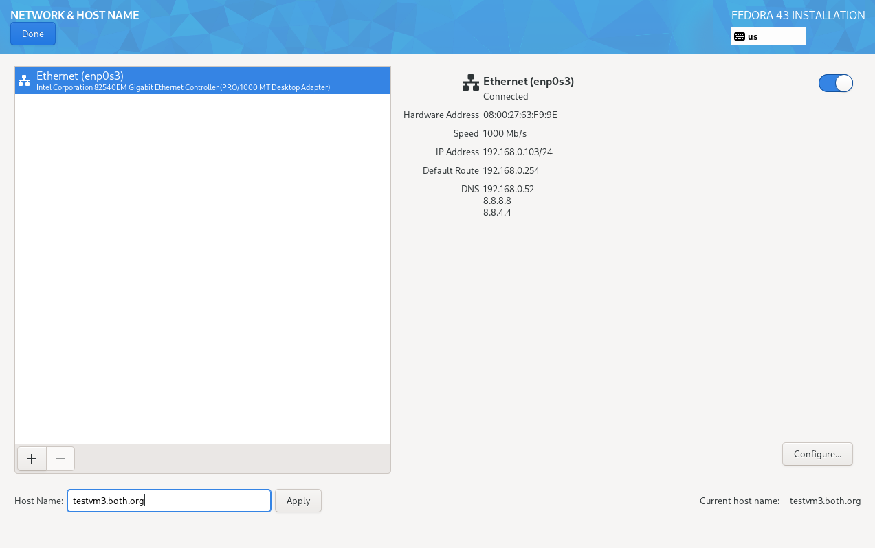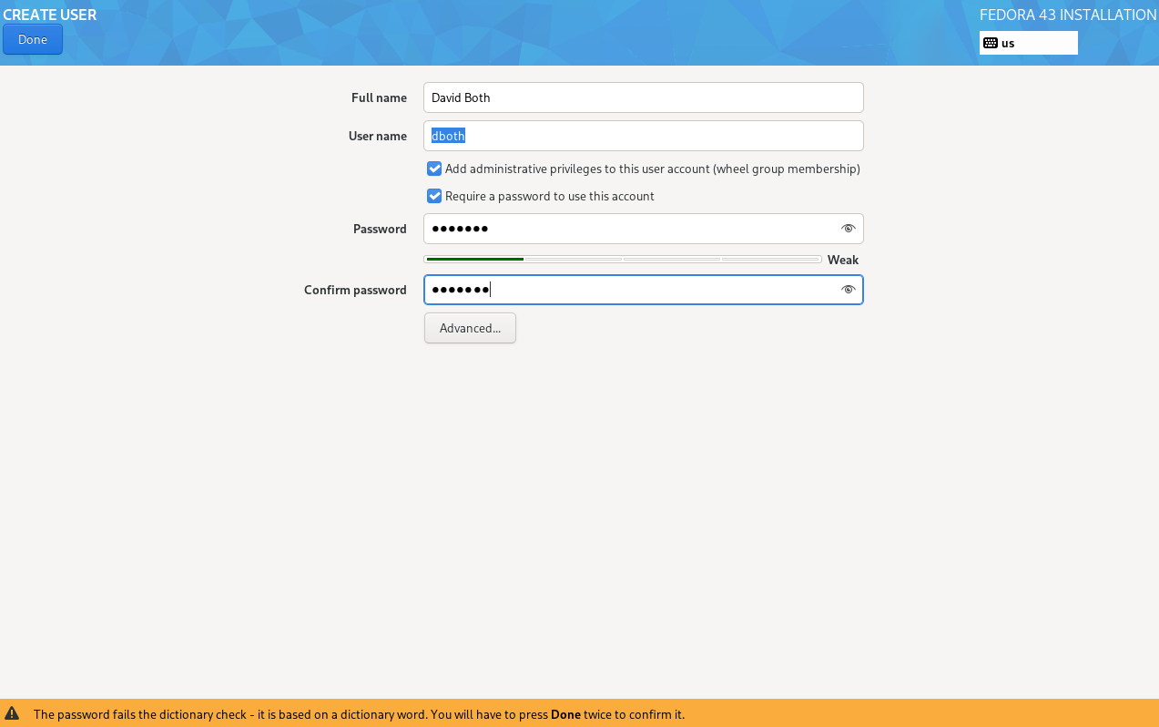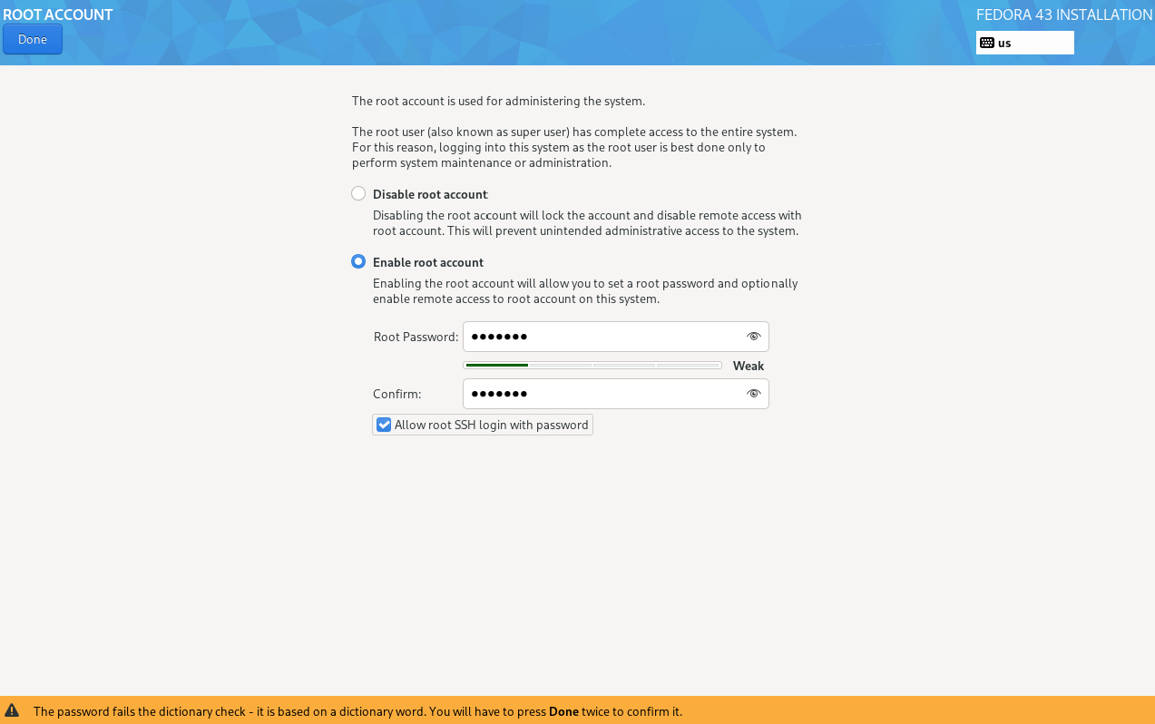 I’ve used a weak password for this test VM but for a working system, whether VM or physical, I always use a very strong password for root. If you do use a weak password, you’ll see a warning at the bottom of the screen indicating that you must click the Done key twice as a means of verifying that you do, in fact, want to use a weak password.