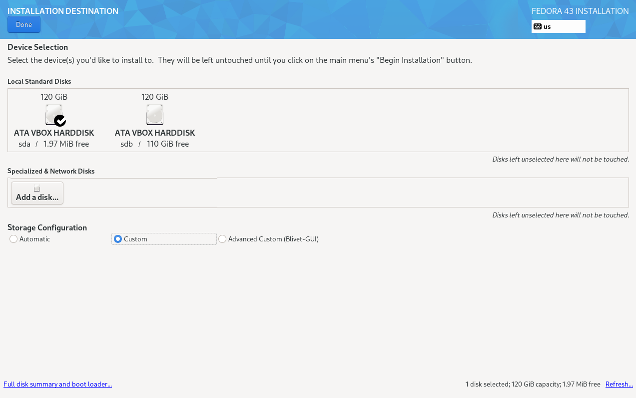 All of the Fedora Spins and Editions use the BtrFS filesystem with no other options available, and that’s perfectly fine for most users, so there are only a couple choices to make. If we choose the Automatic storage configuration, Anaconda would create a simple disk partitioning scheme using BtrFS, as done in the other Fedora Spins and Editions.