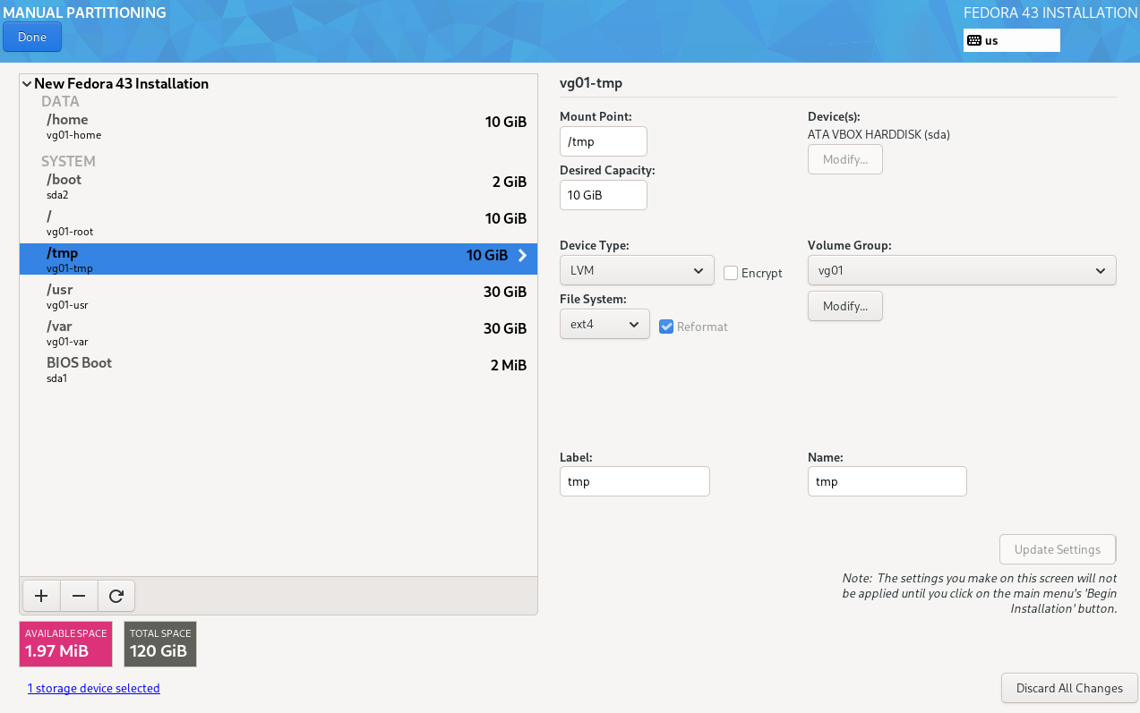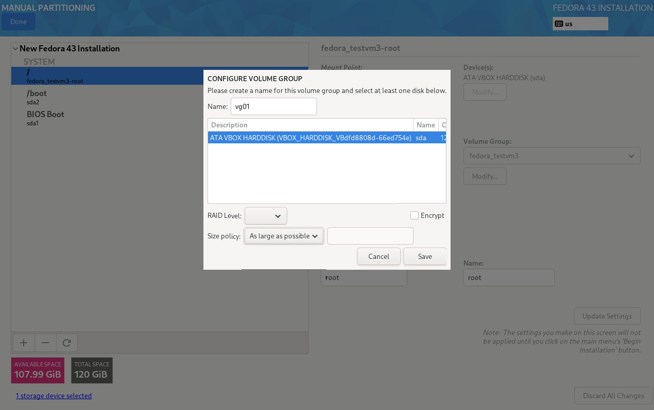 I renamed the VG to vg01 as that’s shorter and less complex than the default one. I also set the VG size to “As large as possible,” to ensure that all the remaining space on the storage device is allocated to the volume group. This doesn’t assign all the space to the logical volumes that are being created, and there will definitely be some free space on the VG to add more logical volumes or to increase the sizes of one or more existing ones when the need arises.