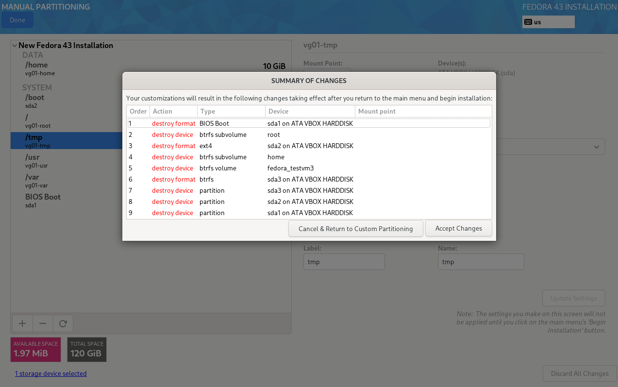 Figure 10 shows the complete partition configuration that I normally use for my testing VMs. This is not what many system administrators would use, but it works well for me and I use the same partitions and logical volumes, with somewhat different sizes depending upon the role of the system, for all my Linux hosts.