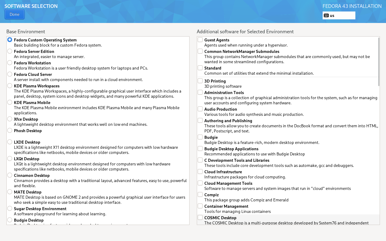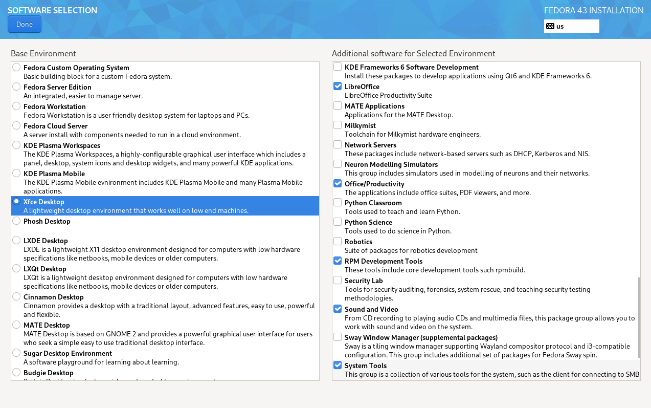 One thing I especially like about Everything is that there are so many choices. I can create a minimal system with no GUI desktop, a server with or without a desktop, or a Fedora Workstation, or a system with any one or several desktops. No matter which Edition or Spin is chosen in the left column, Any of the packages in the right column can be selected to install any of the software groups that make up any or all of the Fedora Spins.